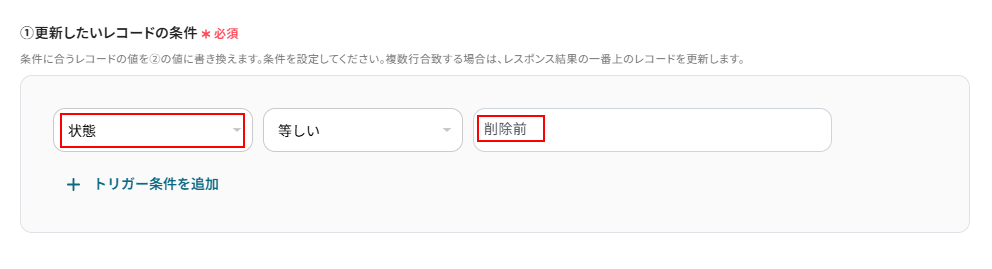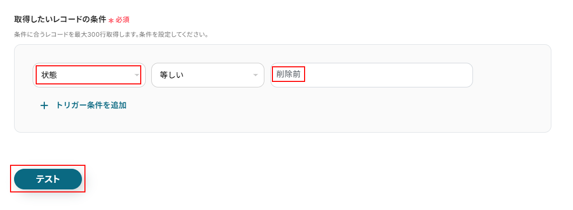 今回は状態が削除前になっているものを削除したいため以下のように、状態、等しい、削除前となるように設定しました。