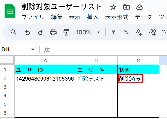 繰り返し処理はGoogle スプレッドシートから削除対象となっているユーザー全てを削除するために行います。
