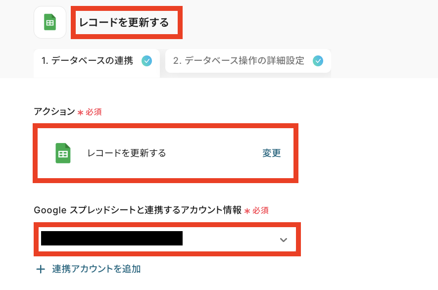 - Google スプレッドシートと連携するアカウント情報:ステップ1で連携したアカウントが表示されていることを確認しましょう。