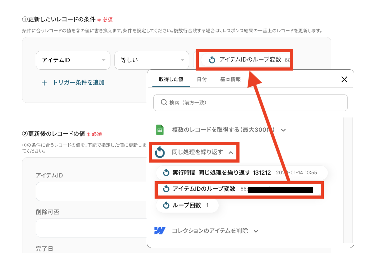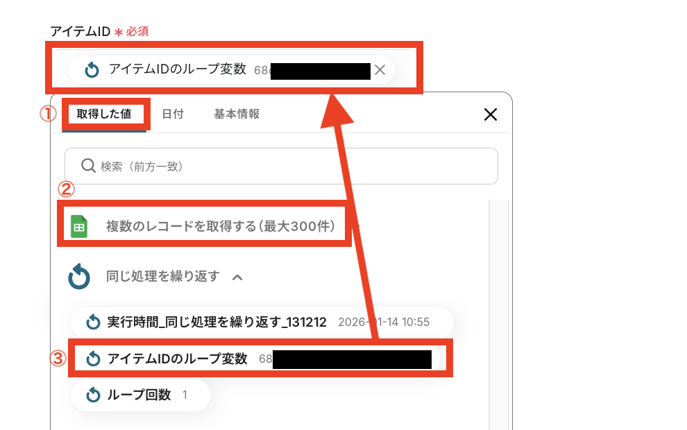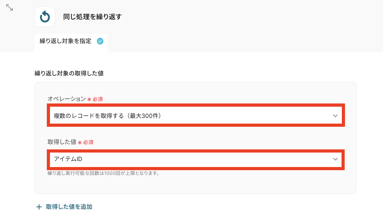 「繰り返し対象」として「複数のレコードを取得する(最大300件)」を選択し「アイテムID(Google スプレッドシートの項目名)」を選んでください。