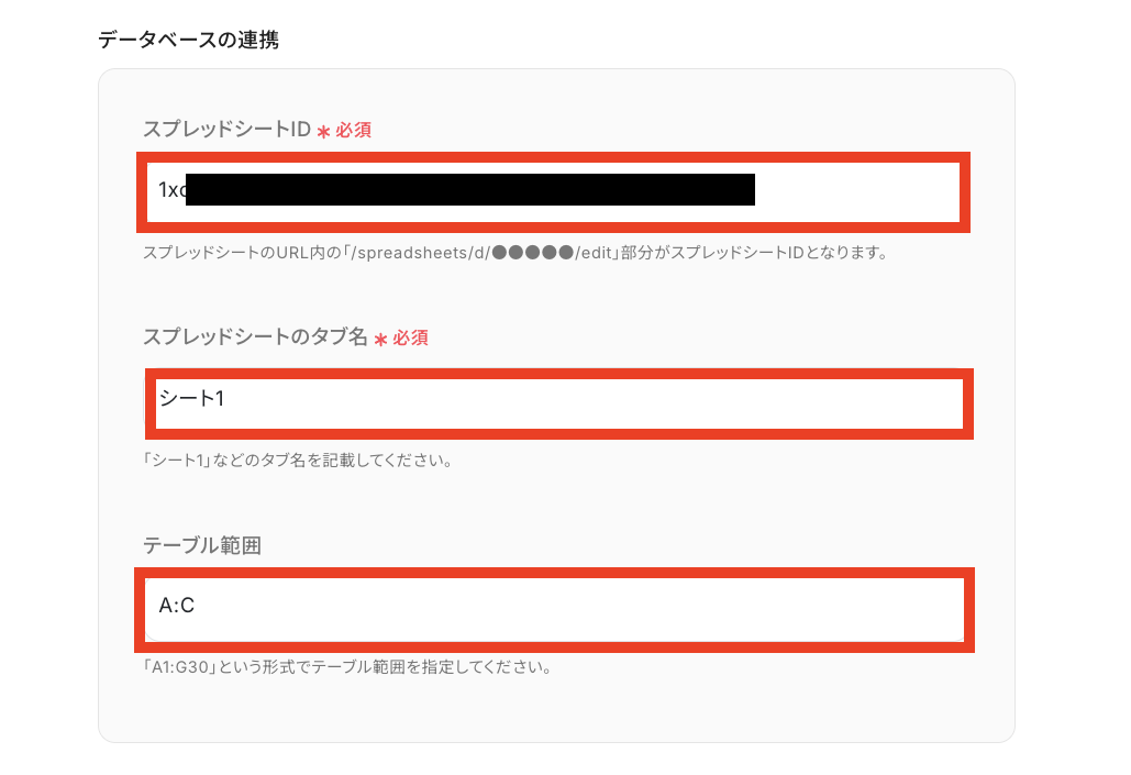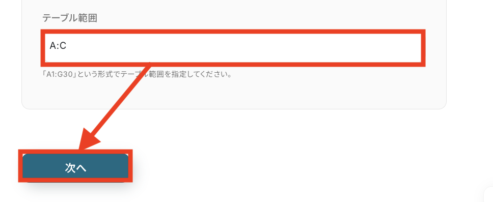 「テーブル範囲」も連携したいGoogle スプレッドシートに合わせて設定します。