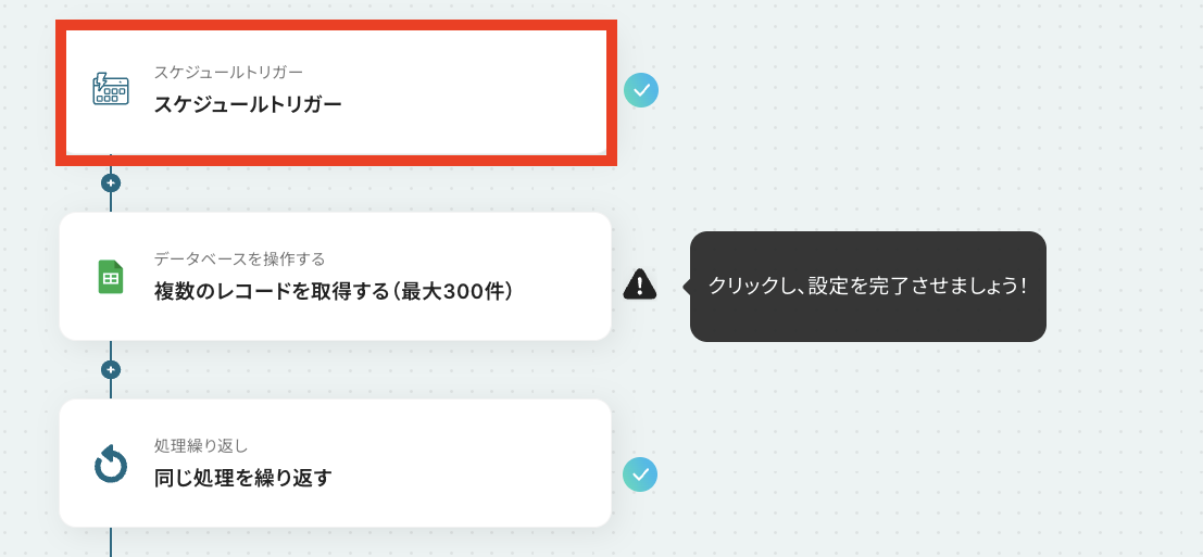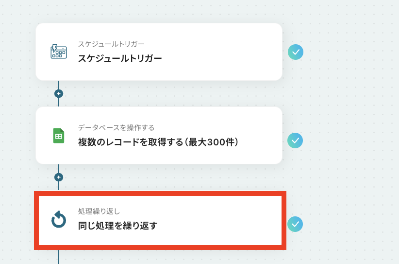 - 「同じ処理を繰り返す」オペレーション間の操作は、チームプラン・サクセスプランでのみご利用いただける機能となっております。フリープラン・ミニプランの場合は設定しているフローボットのオペレーションやデータコネクトはエラーとなりますので、ご注意ください。