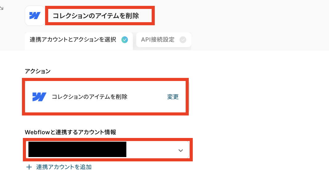 - Webflowの「コレクションのアイテムを削除」アクションでは、削除対象とするコレクションやアイテムのID指定が可能です。前段のオペレーションでGoogle スプレッドシートから取得したIDを変数として設定することで、リストに基づいた動的な削除ができます
