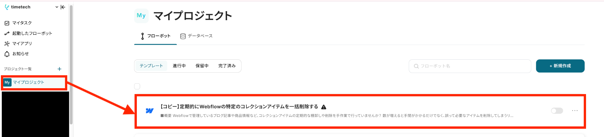 左側にあるメニューの「マイプロジェクト」から、コピーしたテンプレートを開きます。