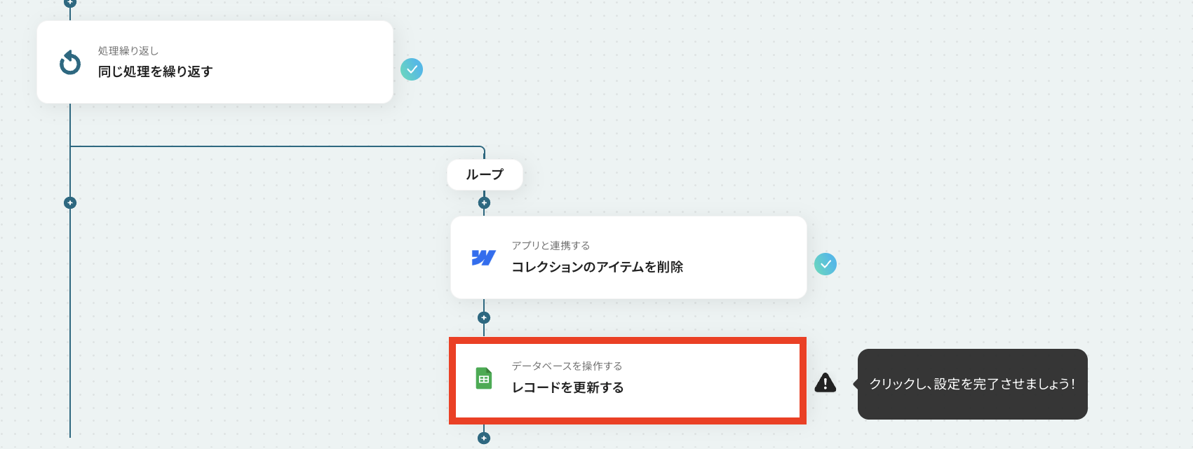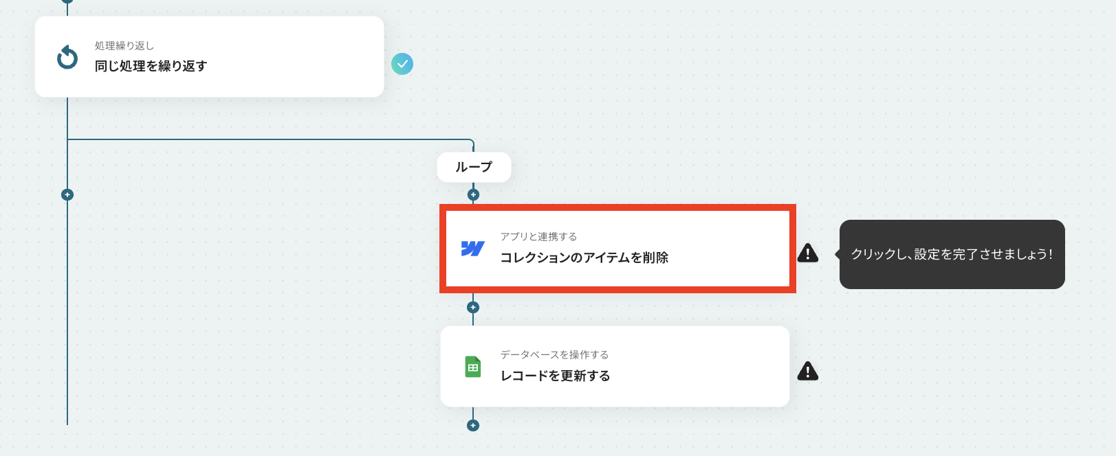 - 繰り返し処理の中で、Webflowの「コレクションのアイテムを削除」アクションを設定し、対象のアイテムを削除します