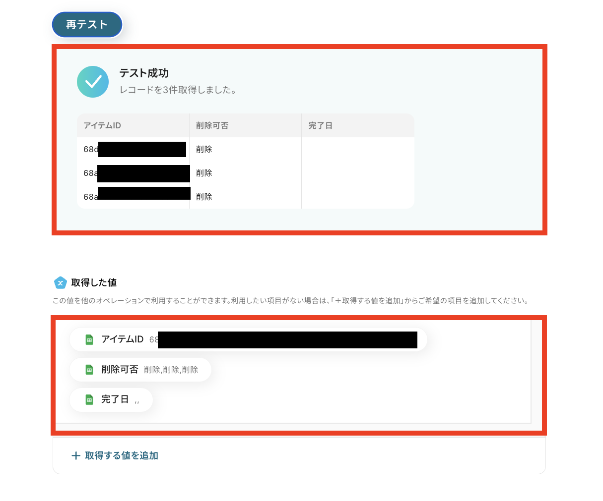 「アイテムID」はステップ5で取得した値を埋め込みます。