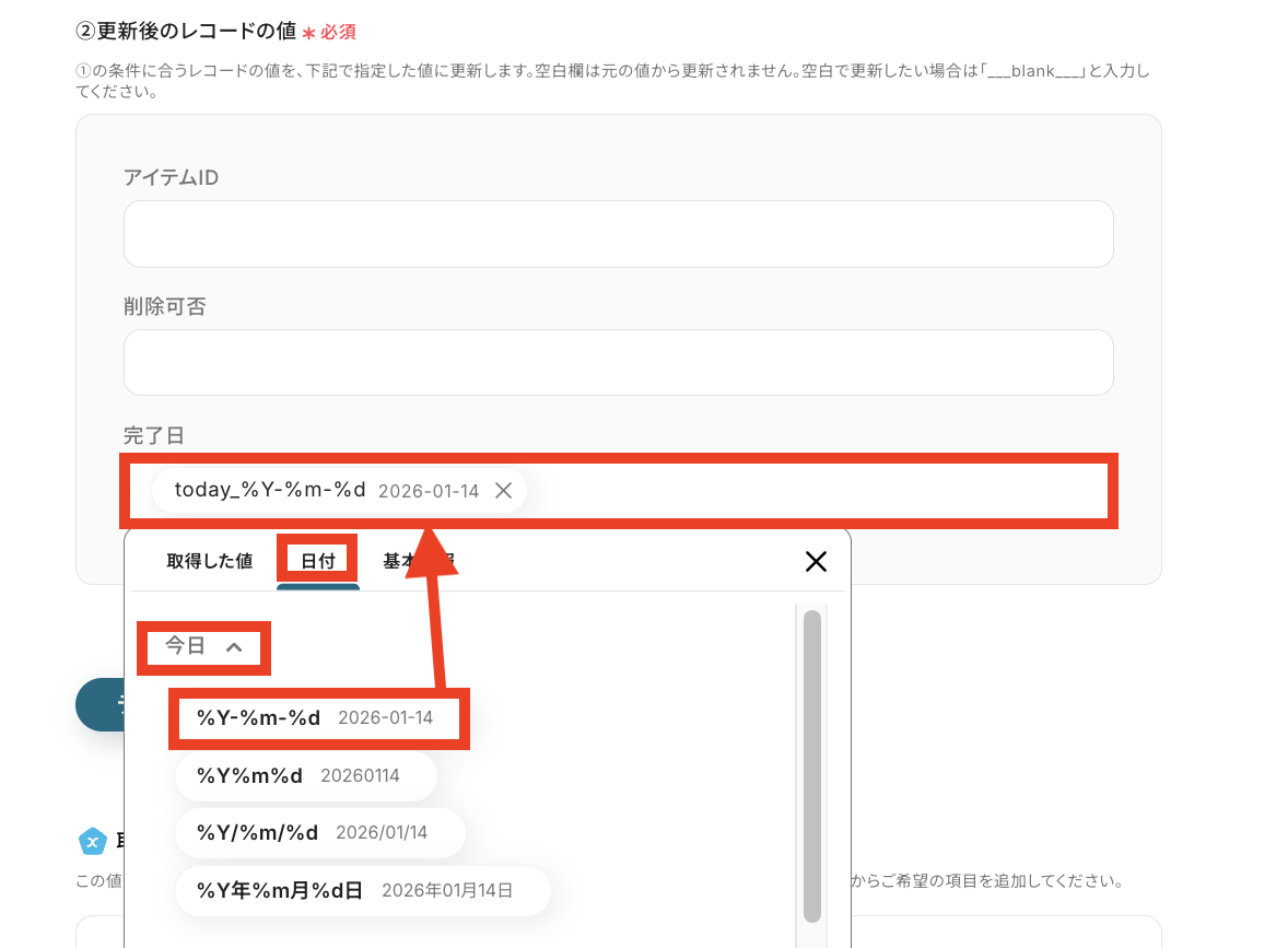 - 最後に、Google スプレッドシートの「レコードを更新する」アクションを設定し、削除が完了したアイテムにステータスなどを記録します
