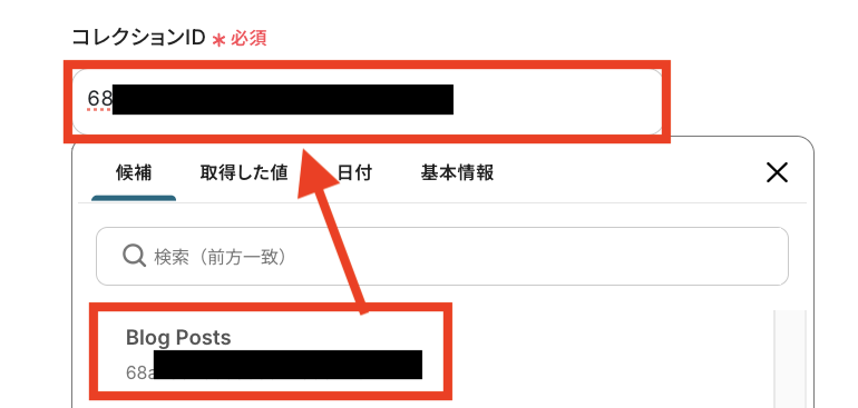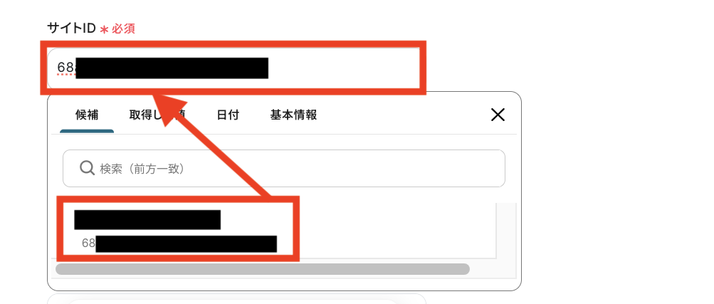 「サイトID」・「コレクションID」は候補から選択することができます。