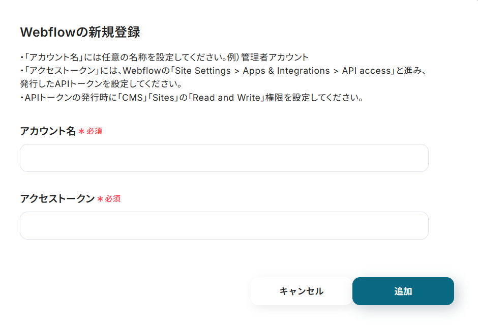 - Webflowでアイテムを追加する際、対象となるサイトIDとコレクションIDを任意で設定してください。