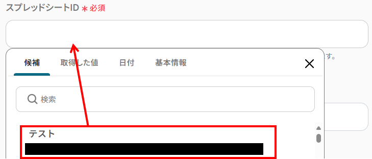 スプレッドシートID:入力欄をクリックすると候補一覧が表示されますので、先ほど作成したGoogle スプレッドシートを選んでください。