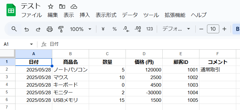 2.ここでは、連携するGoogle スプレッドシートの設定を進めます。 まだ用意していなければ、このタイミングで作成しておくとスムーズです。 今回は、以下のようなGoogle スプレッドシートを用意しているので、こちらのレコードを取得します。