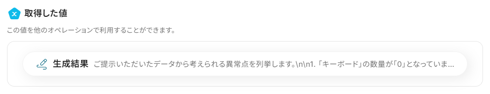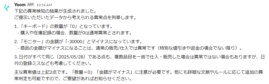 Google スプレッドシートなどの表計算ソフトや各種データソースから情報を取得し、AIで異常を検知した結果をSlackなどのチャットツールに自動で通知する ことができるので、異常発生時のリアルタイムな状況把握と迅速な一次対応が可能になり、業務の見逃しや対応遅れを防ぎます!