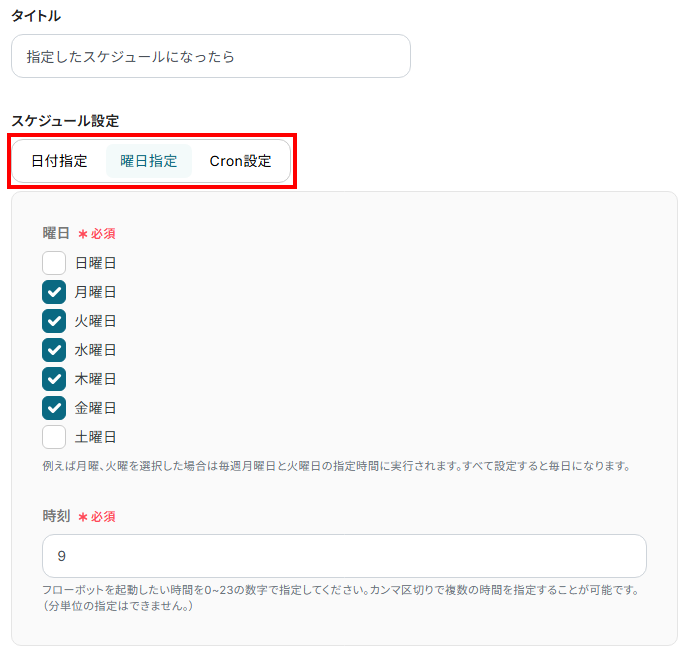 2.次に、トリガーの具体的な設定をしましょう。 「タイトル」は自由に変えられるので、お好みで編集してくださいね。 「スケジュール設定」では、下の赤枠部分のタブから日付や曜日を選んで、トリガーが起動するタイミングを設定できます。お好きな時間に調整してください。 設定が終わったら、「保存する」を押して次に進みましょう。