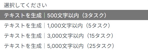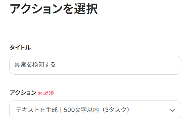 「アクション」は、デフォルトで「テキストを生成|500文字以内(3タスク)」が選択されています。 ()内に表記されている消費タスク量に注意して選択してください。料金プランについて | Yoomヘルプセンター 設定が完了したら、「次へ」をクリックして進みましょう。