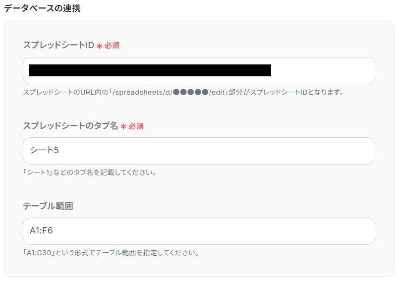 スプレッドシートのタブ名:スプレッドシートIDと同じように、入力欄をクリックすると選択肢が出るので、該当するシートを選択しましょう。
