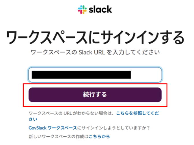 2.サインインする ワークスペースにサインイン画面が出てくるので、ワークスペースのSlackURLを入力し、「続行する」をクリックします。 ※Slackの詳しいマイアプリ登録方法はこちら をご参照ください。 ※管理者による承認が必要な場合があります。詳しくはこちらの公式ヘルプ をご参照ください。