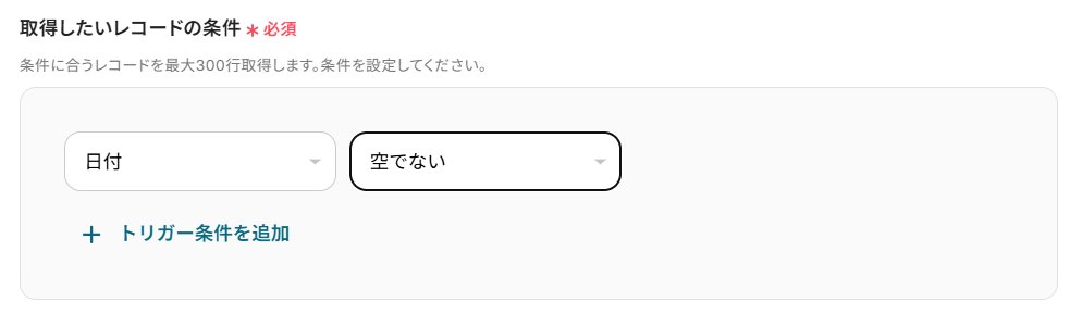 3.ここでは、Google スプレッドシートから取得するレコードの条件を設定します。 「取得したいレコードの条件」に具体的な内容を入力してください。必要に応じてトリガー条件も追加できるので、自由にカスタマイズが可能です。 今回は、日付が空欄でないすべてのレコードを取得する設定にしました。