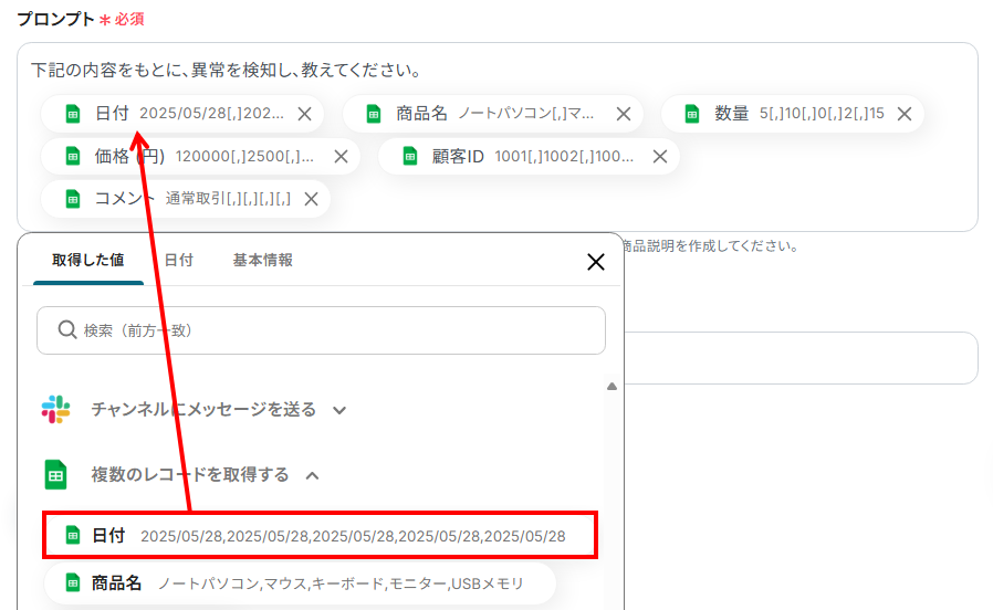 3.次に、AIに具体的なテキスト生成を指示します。 「プロンプト」欄をクリックすると、下に生成結果が表示されます。 先ほどのGoogle スプレッドシートの対象レコードを使って、好きな内容のプロンプトを入力してください。 ※アウトプットについて詳しくはこちら をご覧ください。
