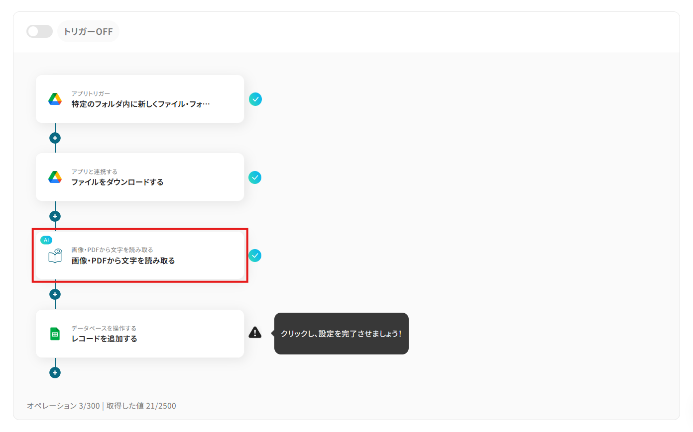 1. AIオペレーションの「画像・PDFから文字を読み取る」をクリックしてください。※OCRや音声を文字起こしするAIオペレーションは、チームプラン・サクセスプラン限定の機能です。フリープランやミニプランでセットするとエラーの原因となりますので、ご注意ください。 ※チームプランやサクセスプランなどの有料プランは、2週間の無料トライアルができます。トライアル期間中は、通常だと制限があるアプリやAIオペレーションもすべて使えるので、この機会にぜひ、気になる機能をお試しください!