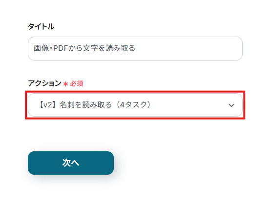 2. テンプレートを使用しているため、アクションには、「【v2】名刺を読み取る(4タスク)」がデフォルトで設定されています。 履歴書やレシート、PDFファイルなどからテキストを読み取る場合には、プルダウンから任意のアクションに変更して活用してくださいね! 設定が完了したら「次へ」をクリックしましょう。