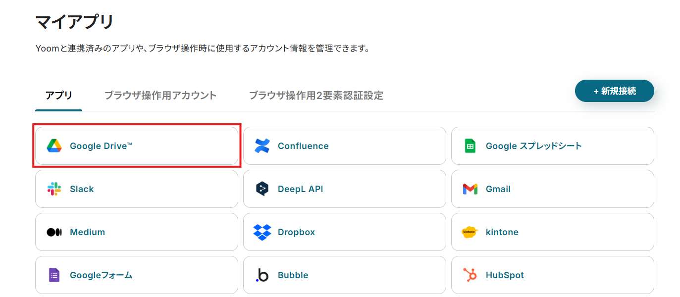 「マイアプリ」欄にGoogle Driveが追加されていれば、Yoomとの連携完了です!