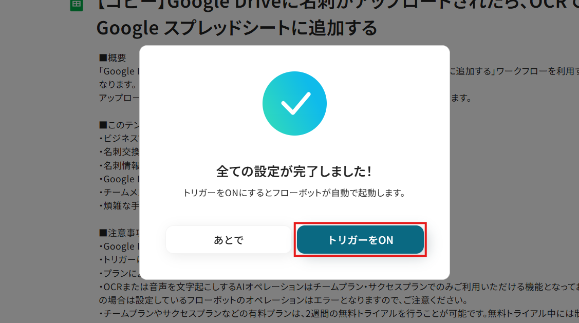 全ての設定が完了すると、「全ての設定が完了しました!」とポップアップが表示されます。 早速フローを稼働させる場合は、「トリガーをON」をクリックし、正常に動作するか確認してみましょう!