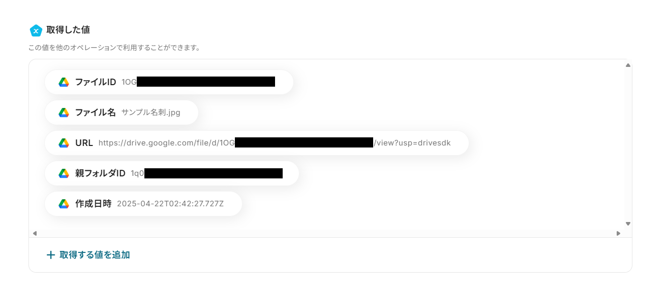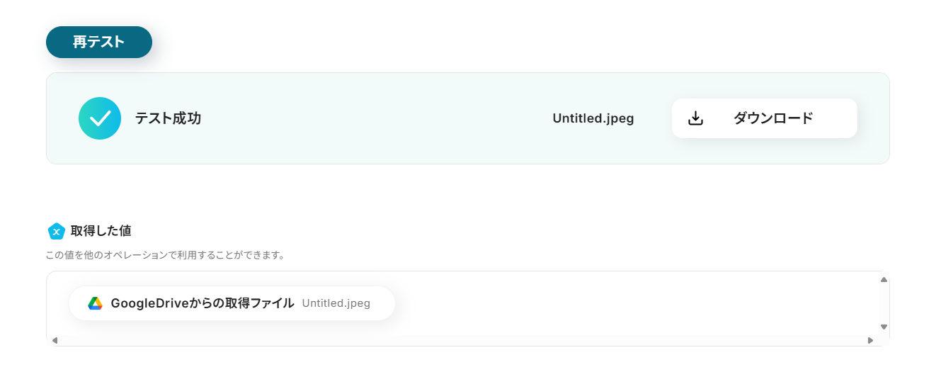8. テストが成功すると、デフォルトの抽出項目と、「追加で抽出したい項目」に設定した項目の値が、GoogleDriveからダウンロードしたファイルから自動で抽出されます。「取得した値」にデータが反映されるので、内容を確認しましょう。 ※ 期待する値が抽出されていない場合には、「使用するAI」を変更し、再度試してみてくださいね!