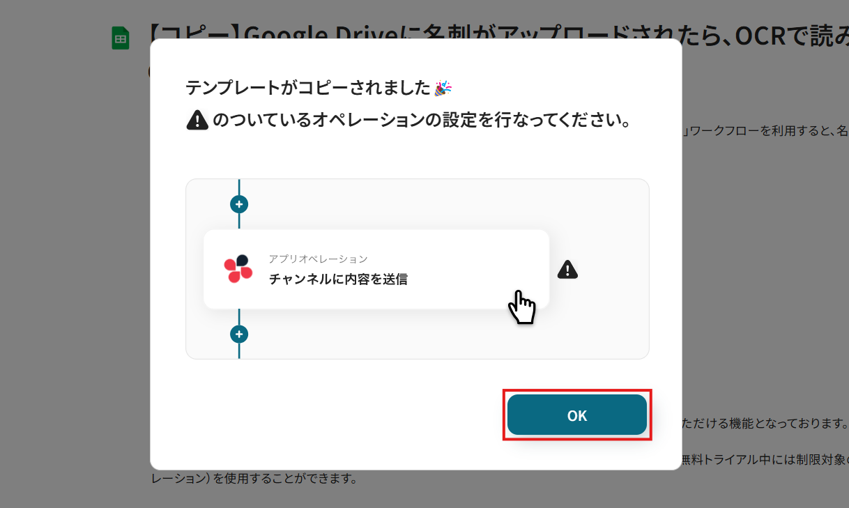 クリックすると自動的にテンプレートがコピーされ、フローボットの設定画面が表示されます。「OK」をクリックして、フローの設定に進みましょう!