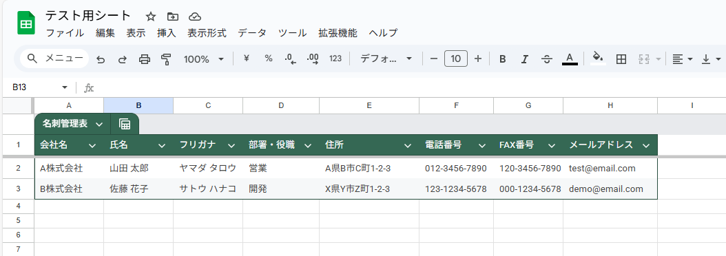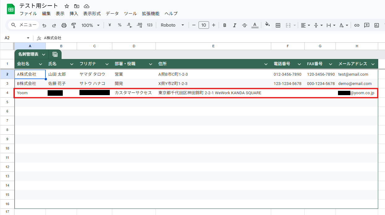 ▼事前準備しておいたテストシートに追加されたレコード▼