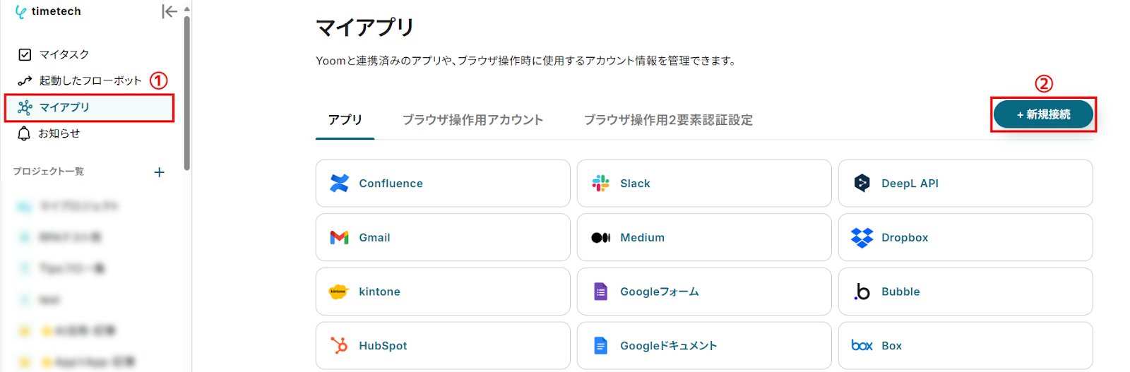 Yoomにログイン後、画面左側のサイドバーから「マイアプリ」を選択し、右側に表示される「新規接続」をクリックします。