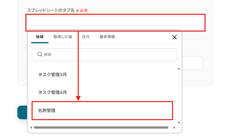 4. 「スプレッドシートのタブ名」に、対象となるスプレッドシートのタブ(シート)を設定します。 入力欄をクリックすると、先ほど「スプレッドシートID」に設定したシートのタブが候補として表示されるため、対象となるタブを選択してください。