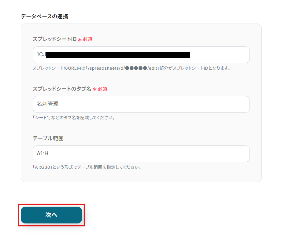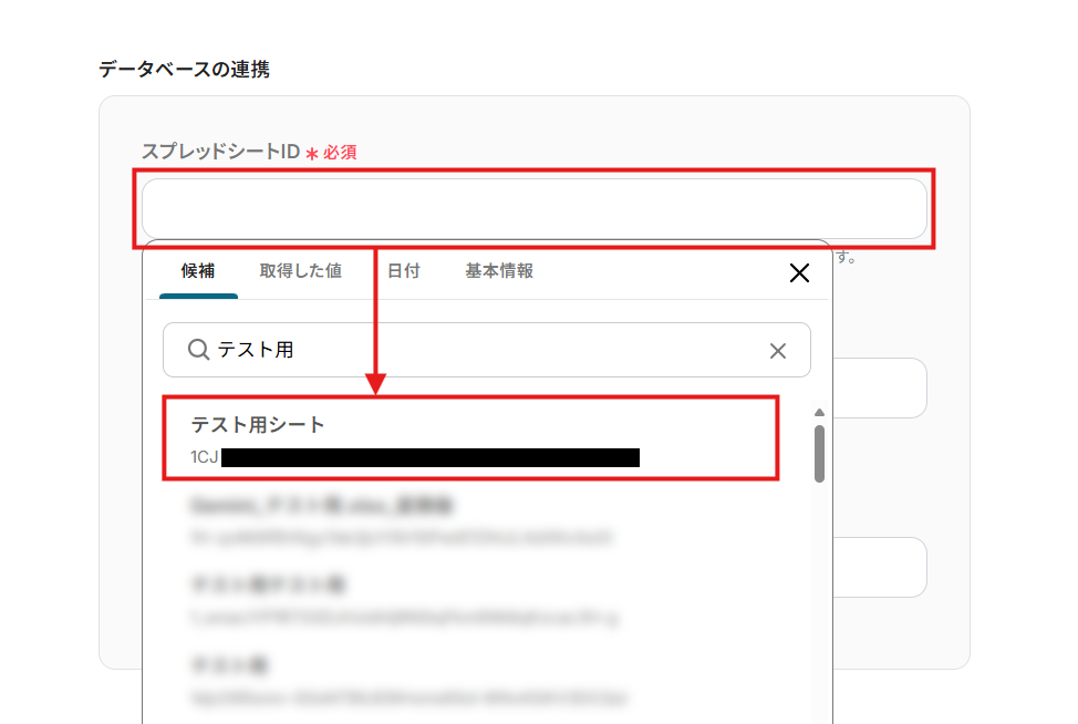 3. データベースの連携の「スプレッドシートID」に、名刺情報を追加したいスプレッドシートのIDを設定してください。 入力欄をクリックすると、連携しているGoogleアカウントのスプレッドシートから候補が表示されます。対象となるスプレッドシートを選択しましょう。