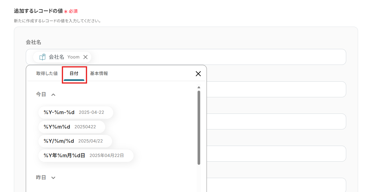 「取得した値」を活用する他にも、「日付」タブから、日付情報を設定することも可能です。 たとえば、Google スプレッドシートに「データ追加日」などの項目がある場合は、日付タブから「今日」を設定しておくことで、データ更新日の日付が自動的に反映されます。