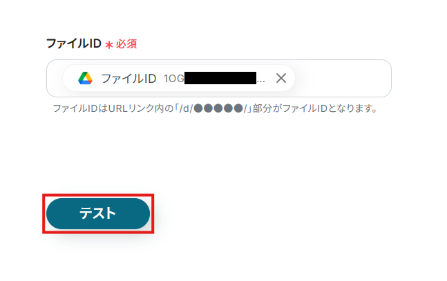 3. 「ファイルID」にはデフォルトで、ステップ3で取得したファイルのIDが設定されています。このままの設定にし、「テスト」をクリックしてください。