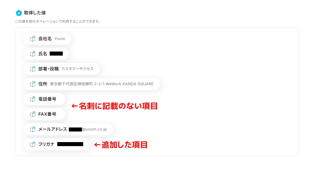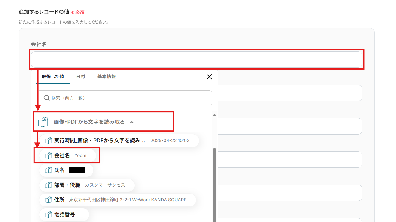 7. 追加するレコードの詳細を設定していきましょう! ※ 「追加するレコードの項目」は、先ほど指定したテーブル範囲の列名になります。 入力欄をクリックし、「画像・PDFから文字を読み取る」のメニューを開くと、ステップ5で抽出した名刺情報が表示されます。各項目に合う適切な値を設定しましょう。選択すると、{{項目名 抽出された情報}}のような形で入力されます。 このように、ステップ5で抽出した値を用いて各項目を設定することで、名刺ごとの情報に合わせた値でデータを自動追加できるようになりますよ!