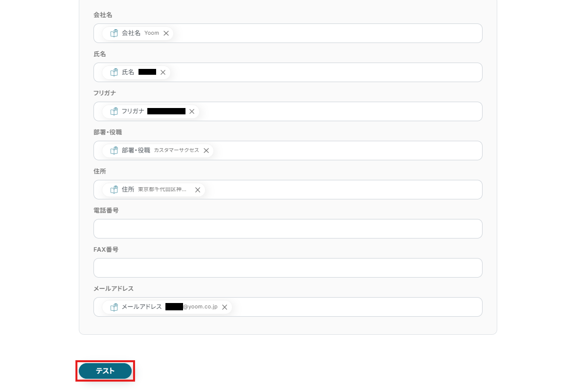 8. 設定を終えたら、「テスト」をクリックしましょう。 ※ 空欄箇所は空欄として追加されます。