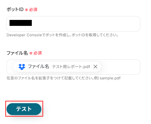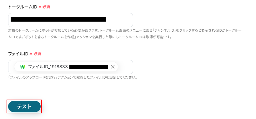 ここまで確認できたらテスト をクリックします。 ※テストをクリックすると、実際にトークルームにファイルが送信されます。