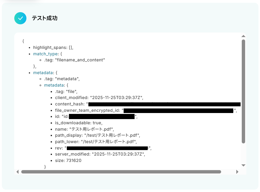 テストに成功するとテスト成功画面が表示され、取得した値が表示されます。 取得した値は実行した結果が設定される動的な値として利用できるため、このあとの設定でも使用します。