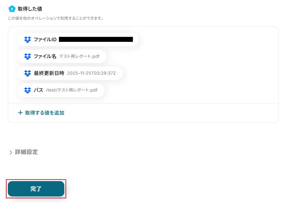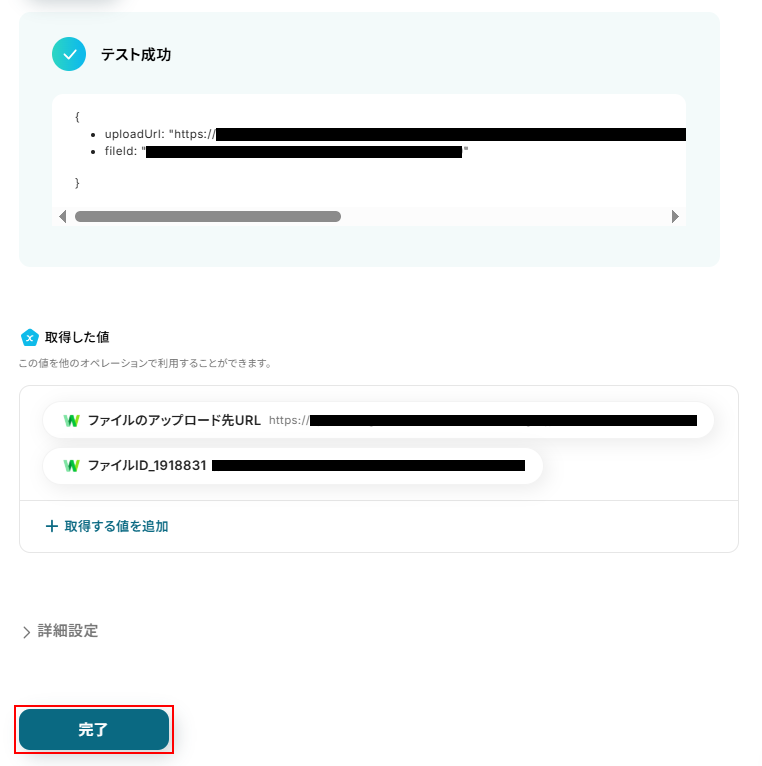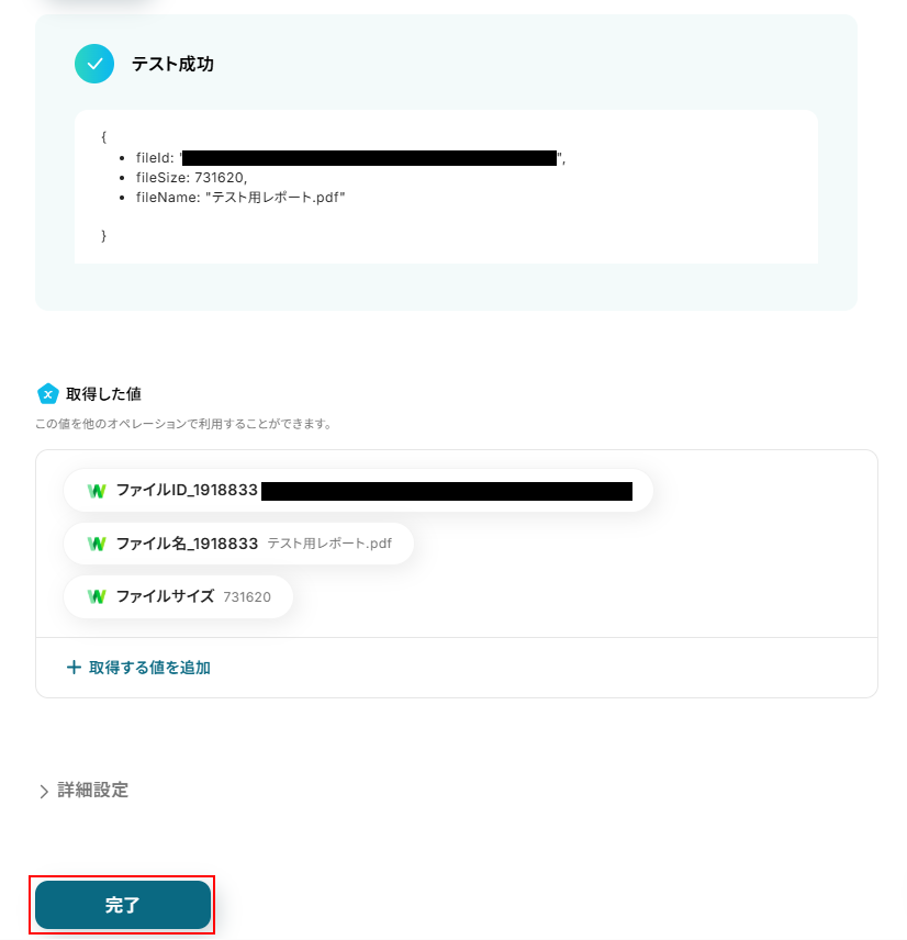 テストに成功するとテスト成功画面と取得した値が表示されますのでご確認ください。 確認できたら完了 をクリックしましょう。