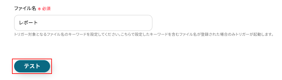 次に、ファイル名を設定します。 今回はファイル名にレポートが含まれるファイルが登録された場合のみ起動させたいため、以下のように入力しました。 ご自身の状況に合わせて設定を行ってください。 ここまで設定できたらテスト をクリックします。