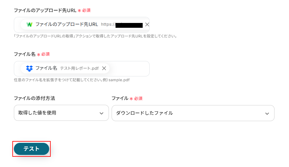 ファイル名はデフォルトで取得した値が設定されています。 項目名だけではなく実際のファイル名が表示されていることを確認したらテスト をクリックしましょう。