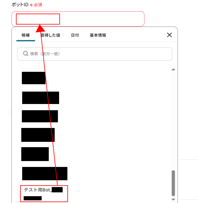 ボットIDを設定します。 入力欄をクリックし、表示された候補の中から使用したいボットを選択してください。