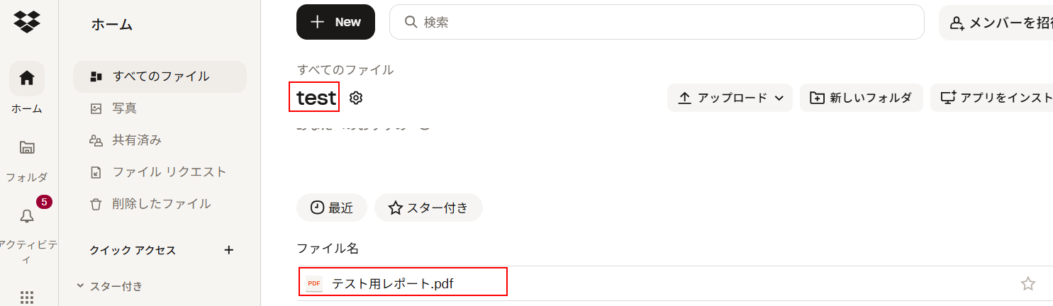 次に、Dropboxの画面に移動し、任意のフォルダ内にレポートを保存します。 今回ご紹介するテンプレートは特定のフォルダ内でファイルが作成または更新されたら起動します。 そのため、実際にテストを行うにはファイルを任意のフォルダ内にアップロードする必要があります。 今回は以下のフォルダにファイルをアップロードしました。