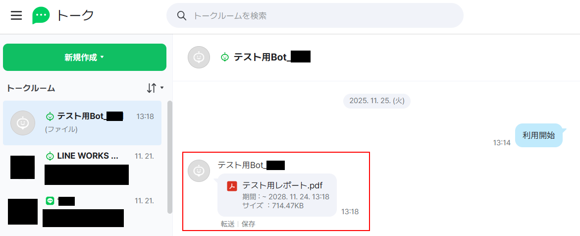 また、実際にLINE WORKSのトークルームにファイルが送信されていますのでご確認ください。