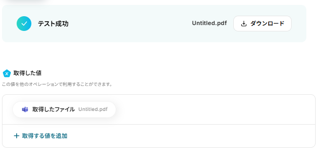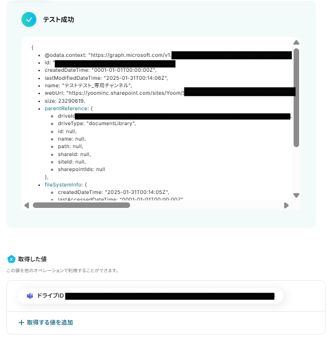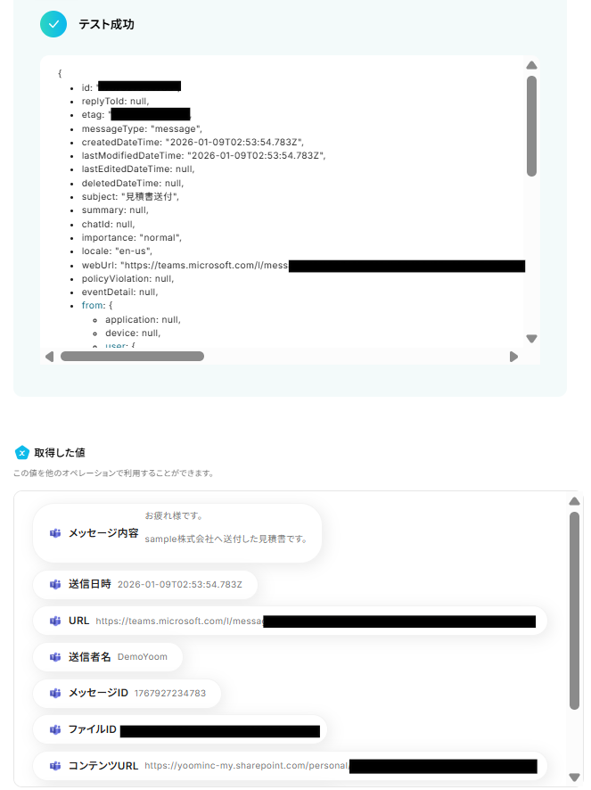 メッセージを送信後、「テスト」をクリックします。 テストに成功するとMicrosoft Teamsの情報が取得した値 に追加されます。 内容が確認できたら、「完了」をクリックします。 ※取得した値 とは? トリガーやオペレーション設定時に、「テスト」を実行して取得した値のことを指します。 後続のオペレーション設定時の値として利用でき、フローボットを起動する度に変動した値となります。