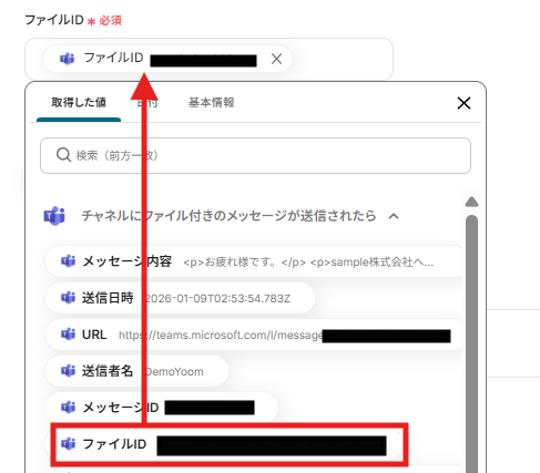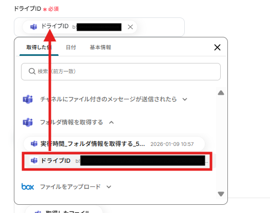 ドライブIDとファイルIDは、以下のように取得した値を引用して選択します。 ここではすでに値が入っているので、【←「フォルダ情報を取得する」で取得した値を引用してください】や【←トリガーで取得した値を引用してください】を削除して設定してください。 取得した値を活用することで、固定値ではなく、トリガーが実行されるたびに最新の情報が反映できます。
