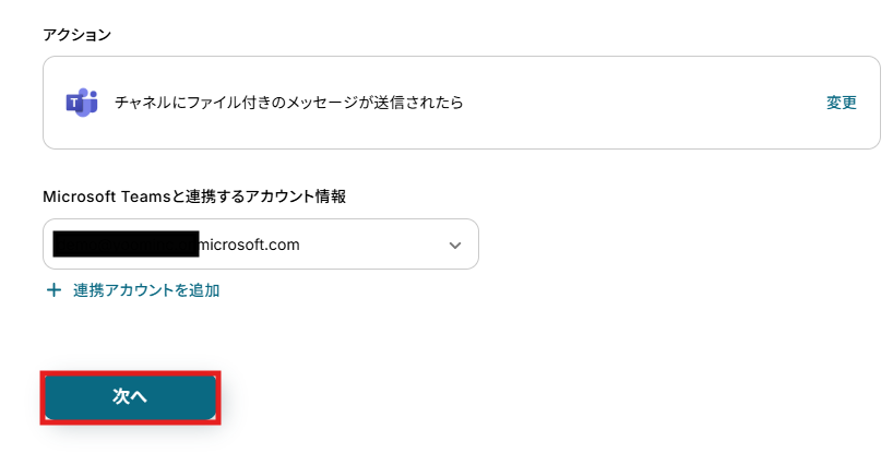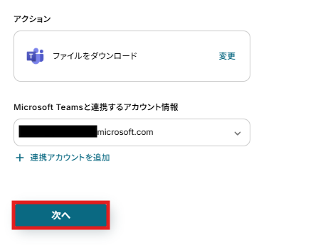 アクションは変更せず、アカウント情報がマイアプリ連携をしたアカウントと一致することを確認したら、「次へ」をクリック。