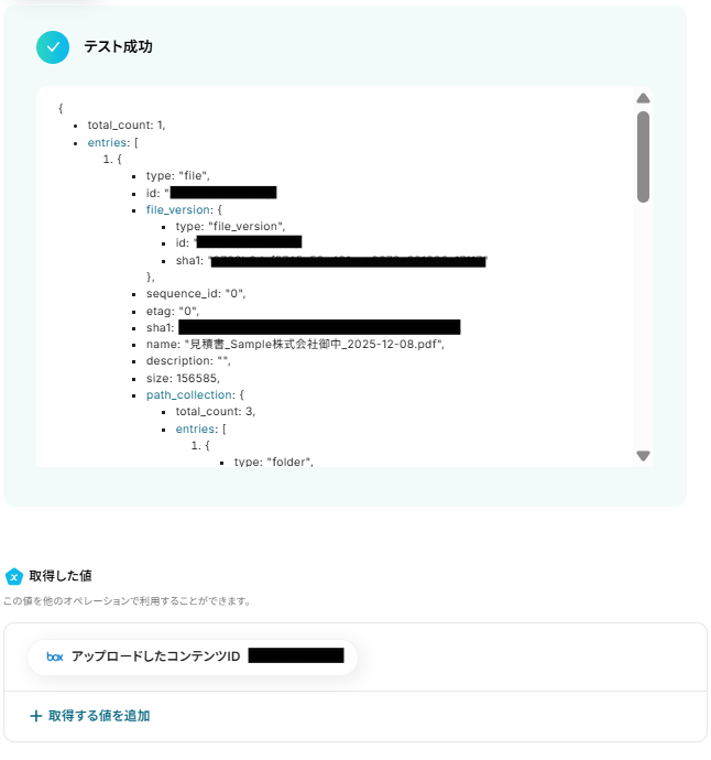 テストに成功したら、Boxのフォルダを確認して、「完了」をクリックします。