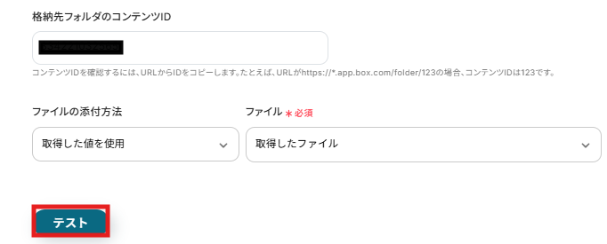 格納先フォルダのコンテンツIDは注記を参考に、IDを設定してください。 ファイルの添付方法及びファイルはそのままで、「テスト」をクリックします。