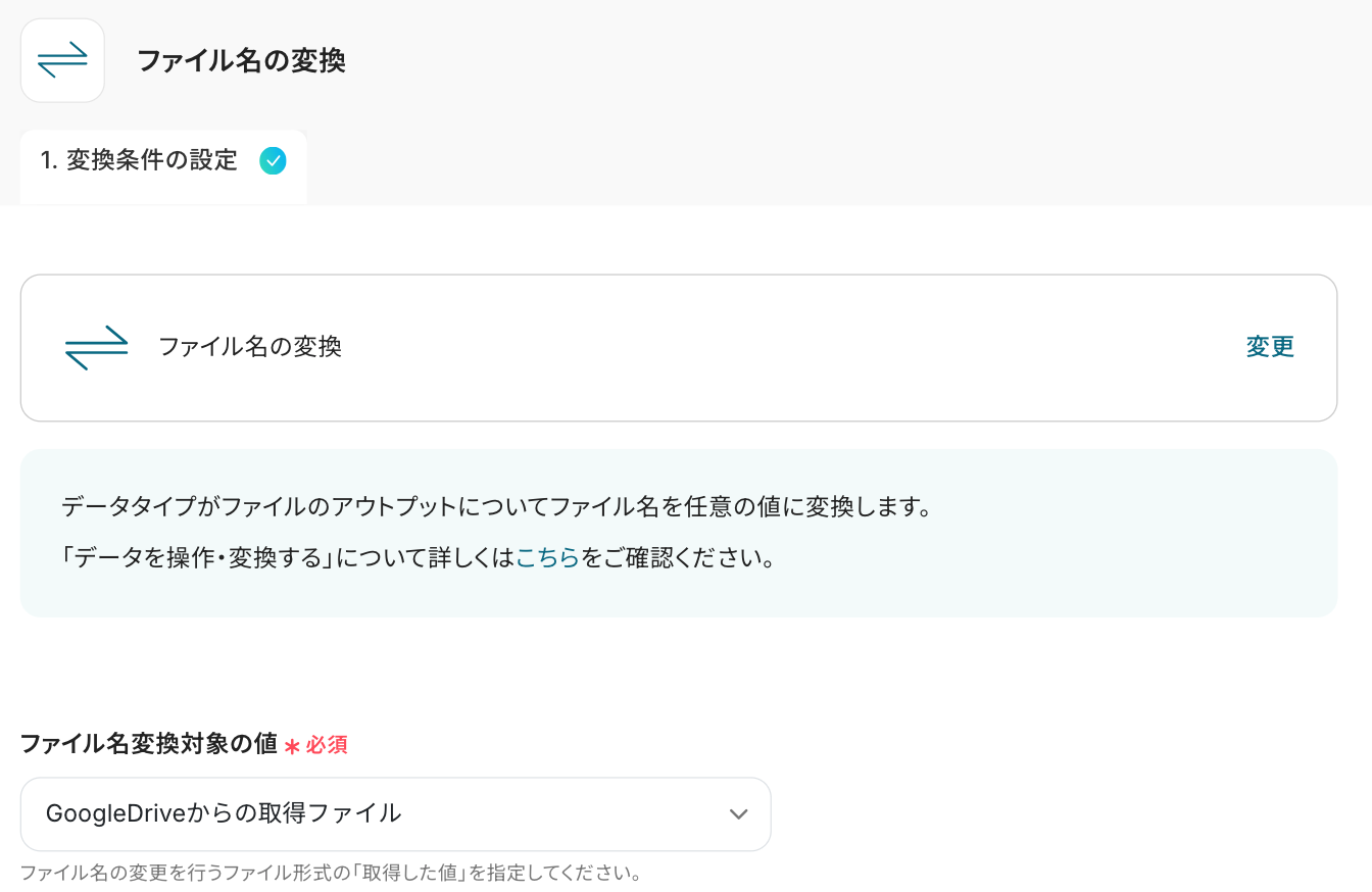 まずは、「ファイル名変換対象の値」 を設定します。 プルダウンから「Google Driveからの取得ファイル」を選択してください。